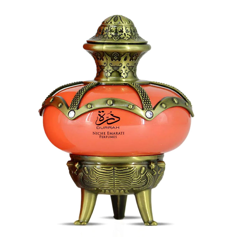 Durrah by Lattafa Niche Emarati is a radiant floral-fruity-musk fragrance created for women who embody elegance, softness, and quiet confidence. It opens with a romantic blend of peach and peony, a fresh and luminous duo that feels juicy, delicate, and instantly uplifting. This graceful introduction creates an atmosphere of modern femininity—bright, charming, and effortlessly refined.